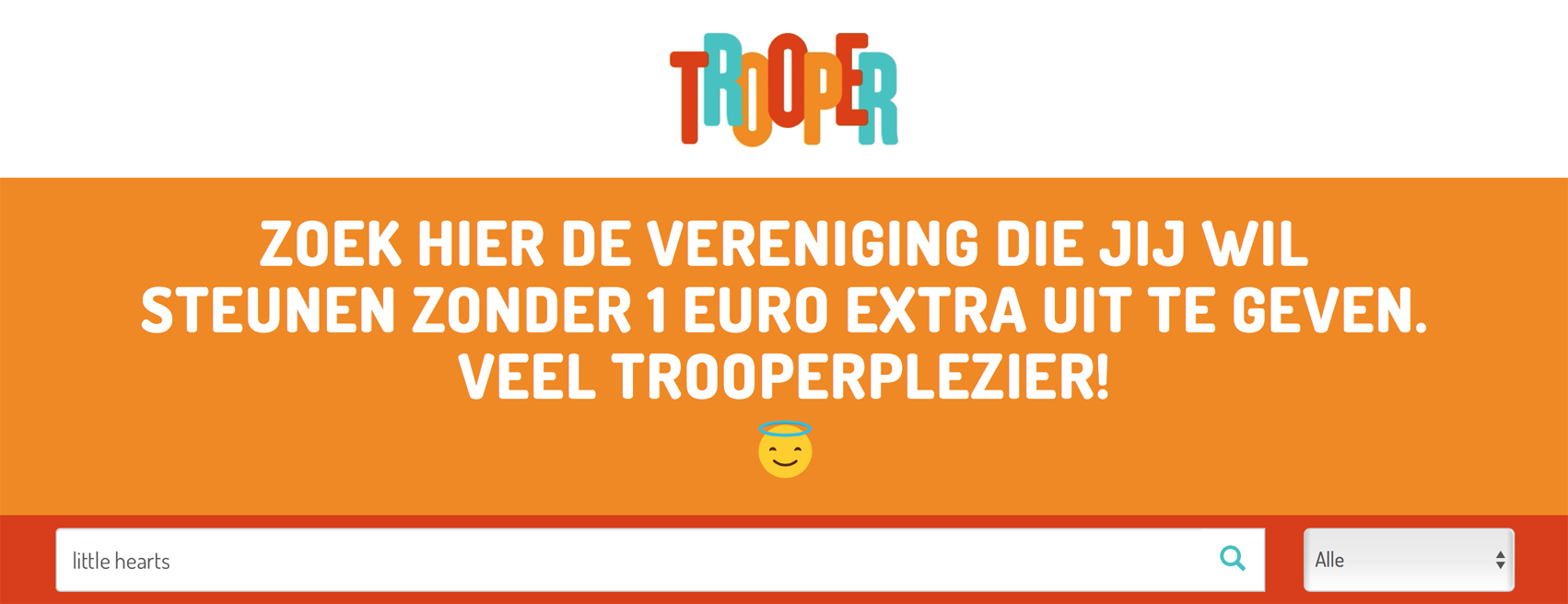 Do you already know Trooper? Trooper is a website that helps you support a good cause when you do your online shopping. You don't pay anything for this (yes, you read it right, nothing!) but a percentage of your purchase goes to a charity, for example, Little Hearts! A lot of shops including Bol.com, Hema, Decathlon, Coolblue, A.S. Adventure participate in this, as does takeaway.com, collect&go, Lidl, and many more!