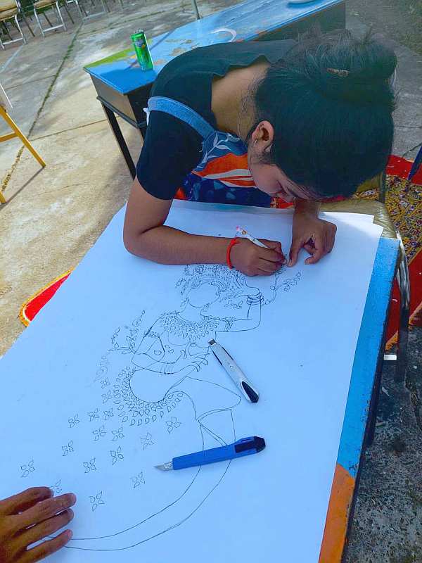 Ilay began by sketching the image of the apsara on cardboard with pencils and pens, and then cut out the shape of the upper body. Sarem painted the background on the canvas and cut the shapes of the apsara’s face and crown, while Michael made the shapes of the lower body. The three artists then assembled all the cut-outs and carefully placed them on the canvas and applied acrylic colours. The live demonstration was conducted with great focus and in silence, the trio working efficiently on their different tasks while collaborating seamlessly on a single artistic product. The painting was completed in just two hours, well before the Christmas party ended, and the result was stunning.