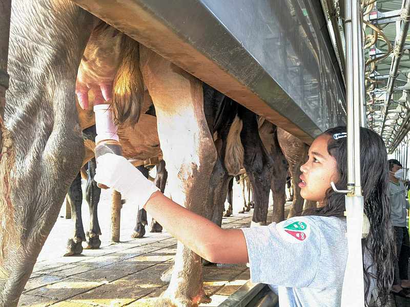 Once the suction cups are in place, the application of a gentle, intermittent vacuum action simulates a calf sucking on its mother’s udders, and the milk flows. It takes 5–10 minutes to milk each cow, yielding about 10 litres of milk each time. Twenty cows are milked every morning and afternoon at Moo Moo. After the demonstration, the kids got to pet some of the cows, including the young calves, and visited the facility’s coffee shop.