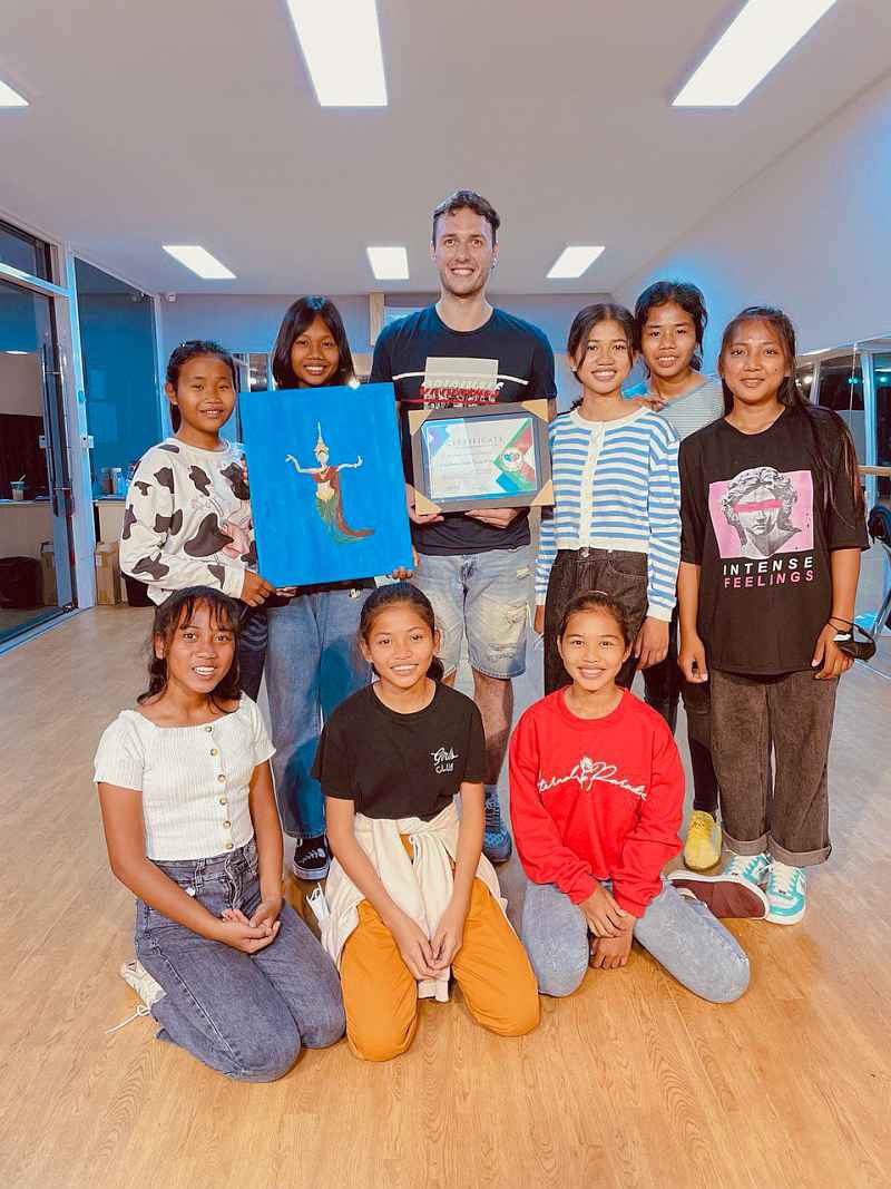 When Viktor Natraseniuk, their instructor, found out that they all hailed from an orphanage, he immediately volunteered to waive their fees. In recognition of his generosity, the girls, accompanied by Tony, paid Viktor a visit at the studio to deliver a certificate of friendship and a painting (featuring an Apsara dancer, of course). Viktor, by the way, is from Ukraine; he has 18 years of experience as a professional dancer and coach and was previously one of the top competitive dancers in the world.