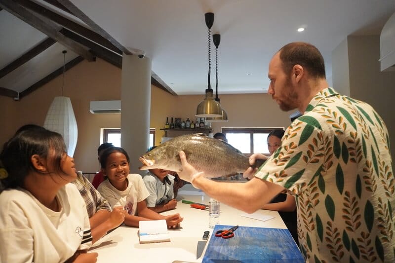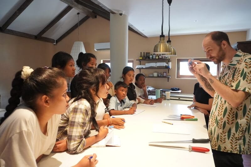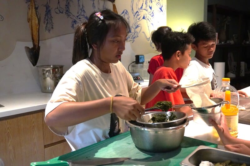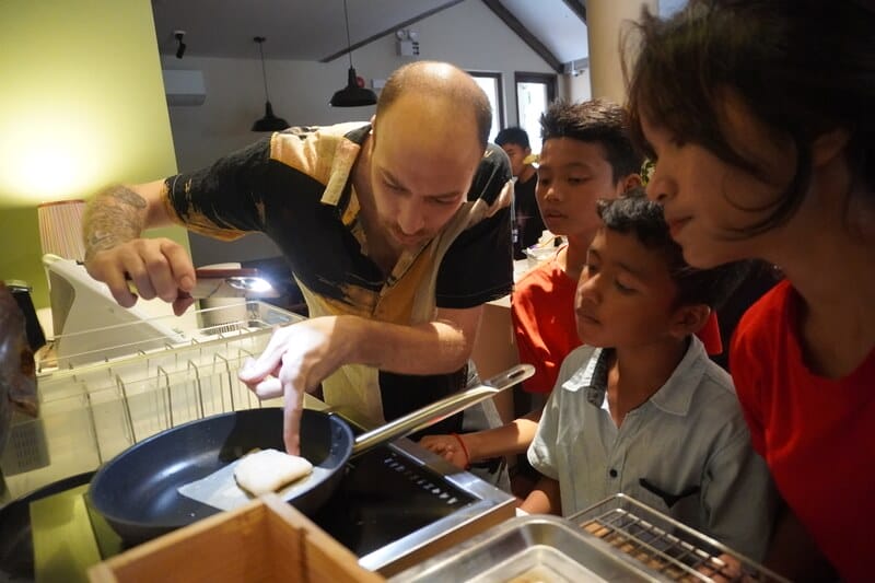 In August, twelve of our kids began free cooking classes under the tutelage of Chef Mario Yufera Blanes, executive chef and co-founder of Casa Blanes, a high-end Spanish restaurant in central Phnom Penh. The kids were still on school holidays, so the cooking classes were initially held twice a week, on Tuesday and Thursday afternoons. Once they were back in school, the frequency of instruction was reduced to once a week. Thus far, they have had five cooking classes, and they’ve learned some important basics, such as how to handle different types of knives, various ways to cook eggs, how to identify fish that’s genuinely fresh, and how to cut, clean and cook fish like a pro. Well done, aspiring chefs!