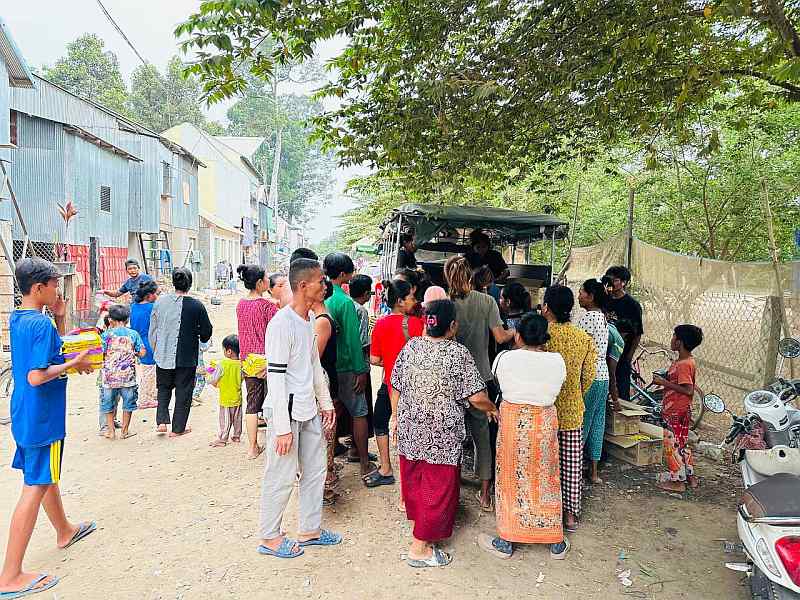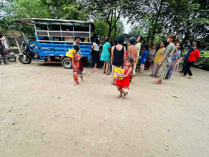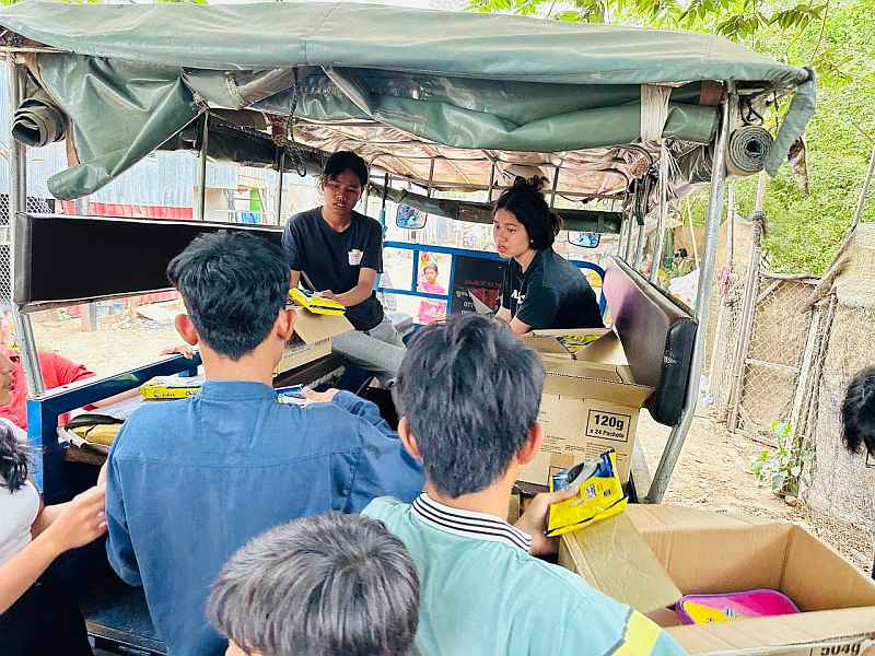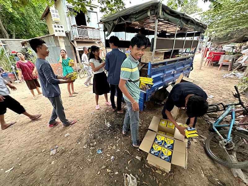 Before anyone could open the snacks, though, some of our older kids were already saying, “Wow, that’s a lot of goodies. We can’t possibly eat all that stuff by ourselves. Perhaps we can share them with the community kids who attend English classes here. Or we can load some on the tuk-tuk and distribute them to kids who live in nearby villages.” The spirit of sharing is well ingrained in our children – something we’re very proud of. So that’s exactly what happened: all the community English learners got some treats the next time they attended lessons at Little Hearts, and we delivered many boxes to Songkheum Thmey, a new settlement for homeless families that Little Hearts helped previously with a clean-up drive and donations of food.