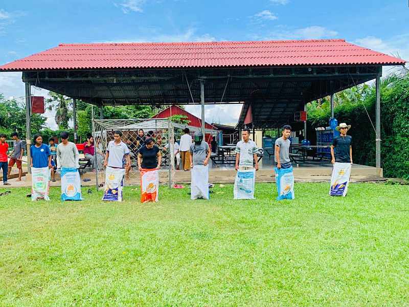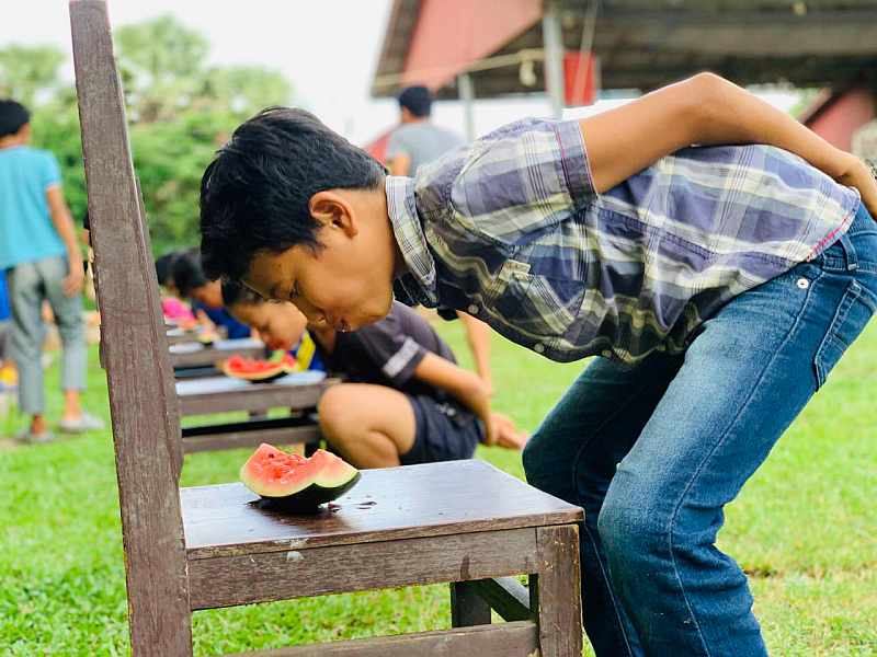 But the kids also associate Pchum Ben with some good fun. For starters, they get the week off from school – something that’s always worth celebrating! And on the afternoon after they have paid their respects at the pagoda, Little Hearts becomes an arena for entertaining outdoor games. The kids play some of their favourite Cambodian and international party games, starting with vai kaam (hit the clay pot), which is not unlike the piñata-smashing contests seen in North America. A clay jar filled with candy and confetti is suspended from a high rope, and a blindfolded player must try to locate it and smash it with a bamboo rod to release a cascade of sweets that everyone races to collect. Then there was the no-hands watermelon eating contest – a juicy if messy affair – followed by a game of tug-of-war and finally several heats of lot bav, a race in which the kids must hop from one end of the field to the other while keeping their feet inside an empty sack.