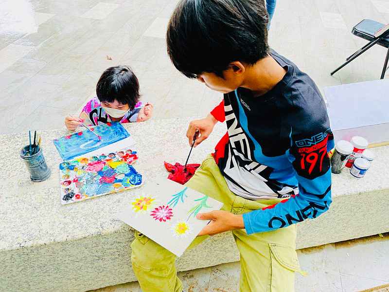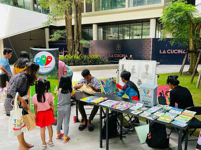 The following Saturday, Soma generously sponsored a table for Little Hearts at Bazaar Market, an arts and crafts fair hosted by The Commune (a new real estate development in Phnom Penh), so that our art students could display and sell their artwork as well as host an art workshop. The event was a great success (despite a brief but heavy downpour), with many visitors stopping by the Little Hearts stand to hear about our mission and history, and plenty of parents bringing their children to participate in the painting and drawing activities hosted by our young artists. The kids (Michael, Elizabeth, Sarem, Dalin and Ilay) had the opportunity to interact with many bazaar attendees and to show off their skills with the brush. We also received substantial monetary donations and made some promising contacts.