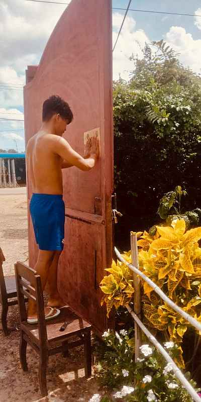 The kids were put into small teams and set about various tasks. The bamboo fixtures in the art gallery and the parking area were re-varnished; the water wheel in the front garden was fixed and set back in motion next to the pond; the front gate got a fresh coat of paint; the lawn was mowed and the hedges were trimmed; and all the frayed and torn cushions from the library and the dormitories were stitched back into shape. (That last chore is more important than you think! The kids lounge and sprawl on the cushions while watching their favourite programs on movie nights…)