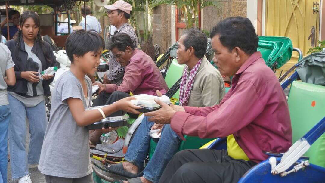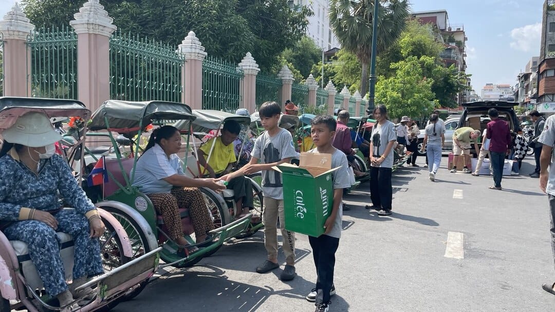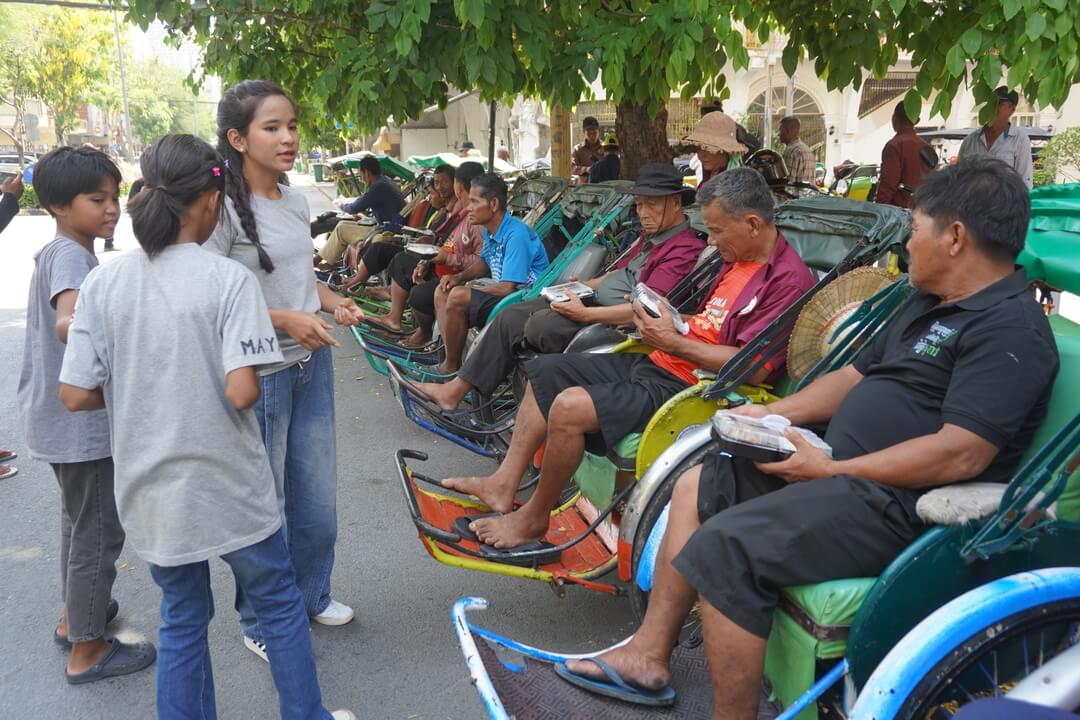 Our target group on Labour Day was the cyclo drivers who ply the avenues of central Phnom Penh. (What’s a cyclo, anyway? It’s a three-wheeled, pedal-powered taxi used in much of Southeast Asia. Here in Phnom Penh, cyclos are used primarily by tourists for sightseeing.) Cyclo drivers are a vulnerable group that Tony has taken a special interest in, having often noticed them idling without work during his morning walks. Many of them sleep on their cyclos because they don’t have a home, relying on petrol stations to use toilet facilities and bathe. Their livelihoods depend entirely on having passengers; if there are no passengers, they earn nothing and have little to eat. Especially during low tourism season, they often go hungry.