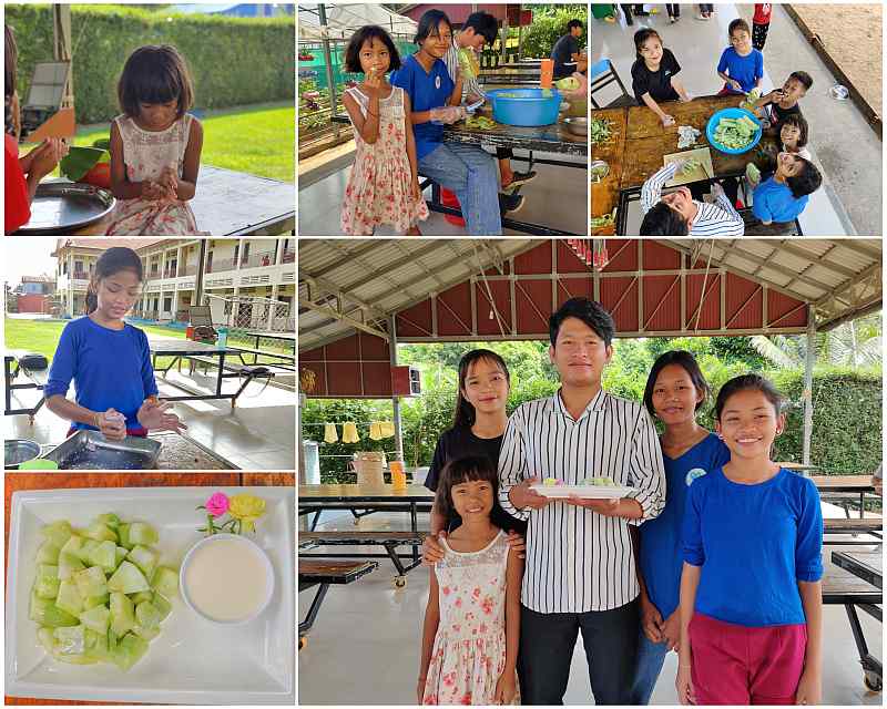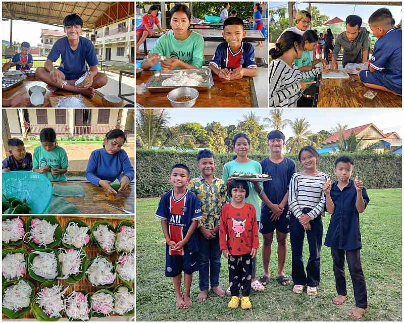 After they were divided into teams, the kids studied traditional Khmer recipes, procured the necessary ingredients and invaded the kitchen. Working in shifts and with the help of Reaksmey, our chef, and Khun, our breakfast specialist, they produced two desserts by lunchtime and two more for dinner. (Thus, as Roxanne and Bjorn had hoped, they were kept busy for an entire day!)