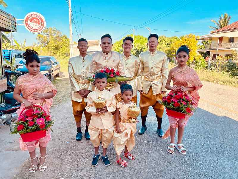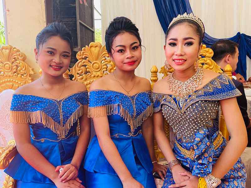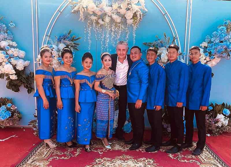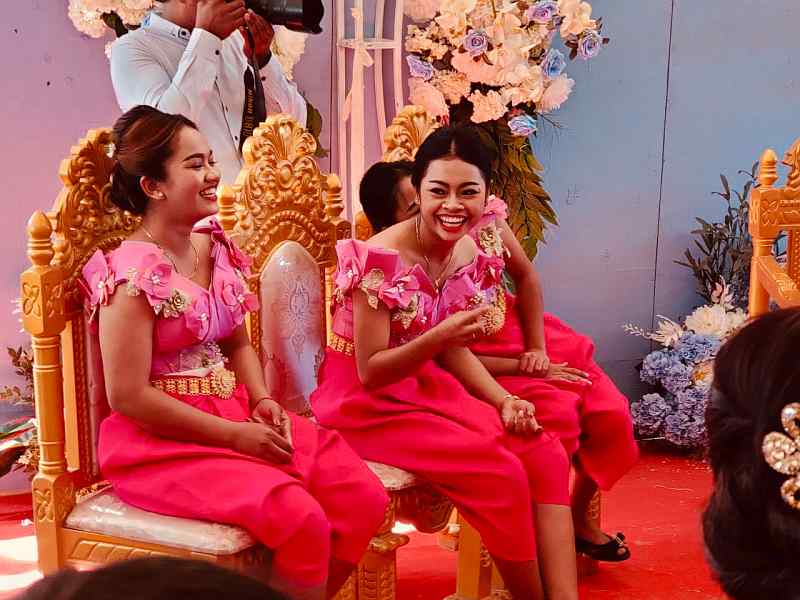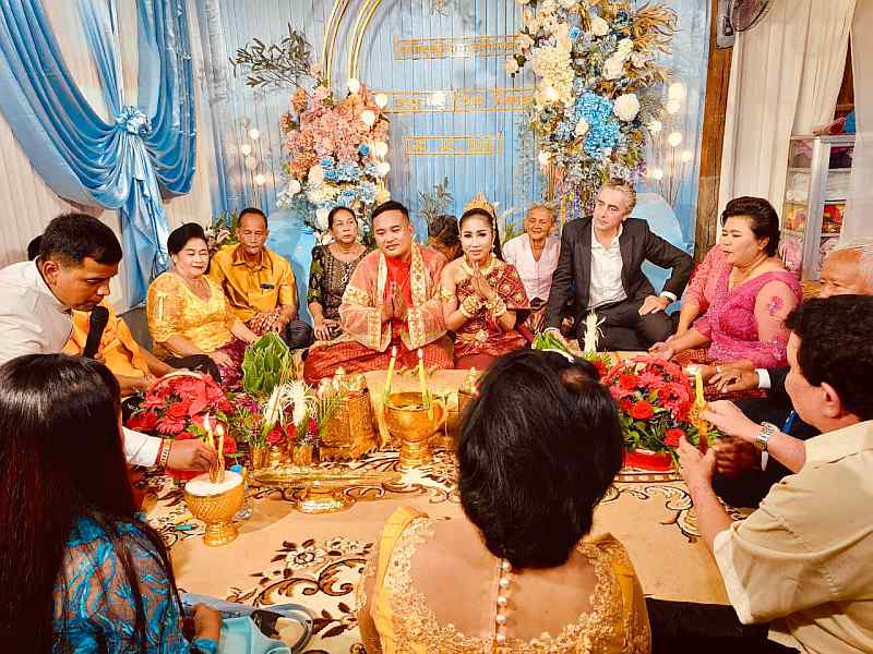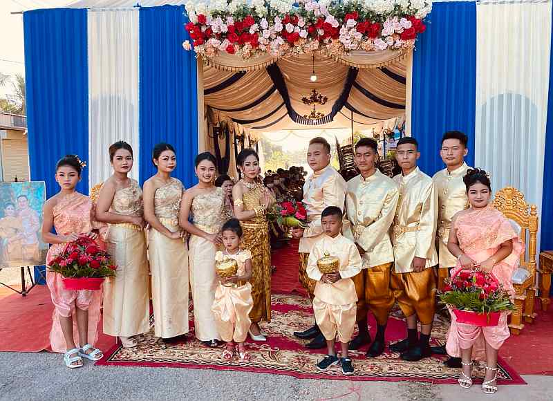 Last Sunday, Koem Heng looked radiant in her traditional dress – one of many she wore in the course of the ceremony. Cambodian weddings are quite different from western ones. For one thing, they start very early in the morning; as the father of the bride, Tony had to be there at 5.30 am! They are typically held under a tent erected on a lawn or along the road and continue for the entire day. Both bride and groom wear colourful silk attire, which they must change several times, as each stage requires a different outfit. The wedding culminates in a knot-tying ceremony and the throwing of white palm seeds.